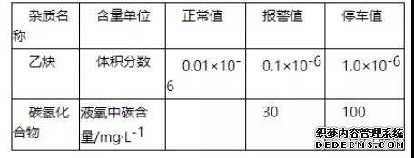 1)采用色譜儀連續(xù)分析乙炔和碳氫化合物含量。在沒有條件分析原料空氣時。要經(jīng)常注意風向。在原料空氣處于乙炔站附近的下風向時,要采取縮短液空吸附器的切換周期等措施。液氧中雜質(zhì)含量至少8h要分析一次。規(guī)定指標見表;