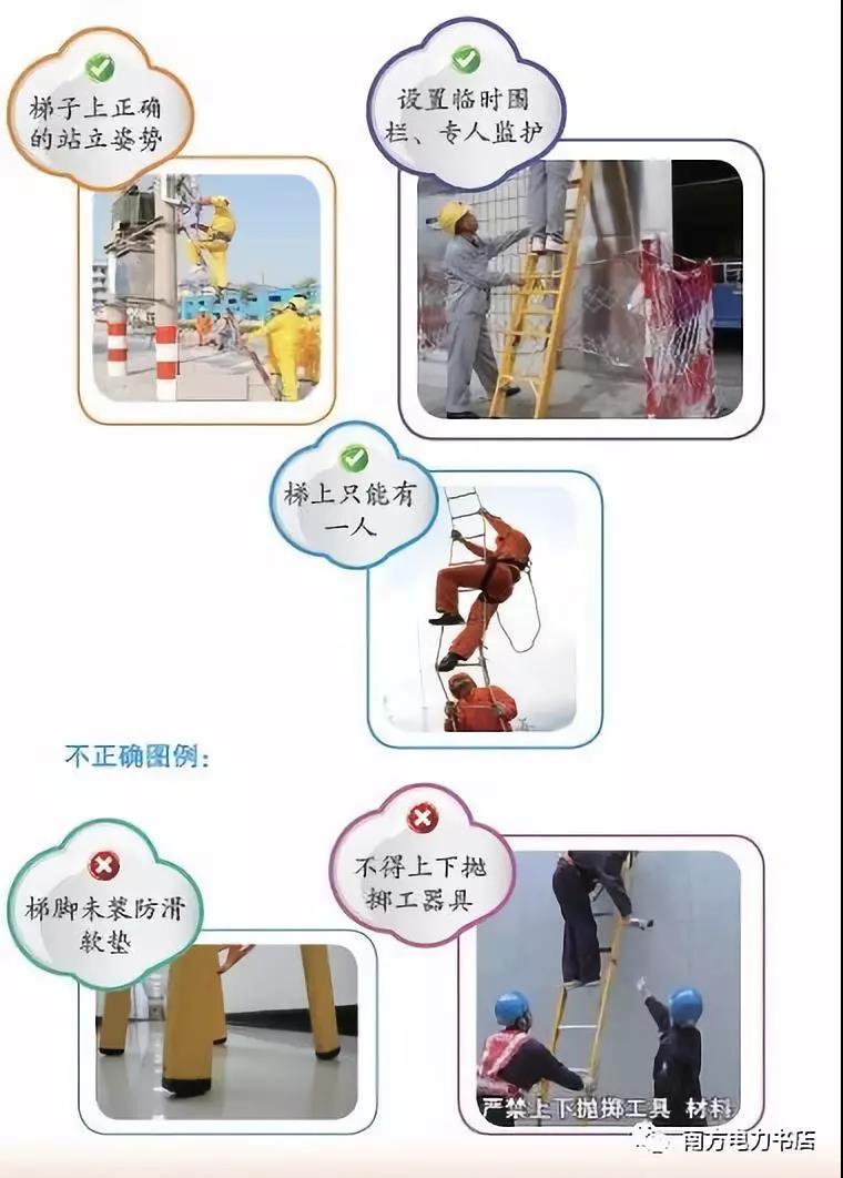 (7)作業(yè)人員在梯子上正確的站立姿勢(shì)是:一只腳踏在踏板上,另一條腿跨入踏板上部第三格的空擋中,腳鉤著下一格踏板;人員在上、下梯子過(guò)程中,人體必須要與梯子保持三點(diǎn)接觸。