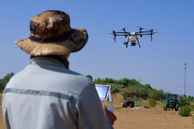 ↑這是內(nèi)蒙古鄂爾多斯市杭錦旗庫(kù)布其沙漠中的生態(tài)修復(fù)景觀(2018年7月11日無人機(jī)拍攝)