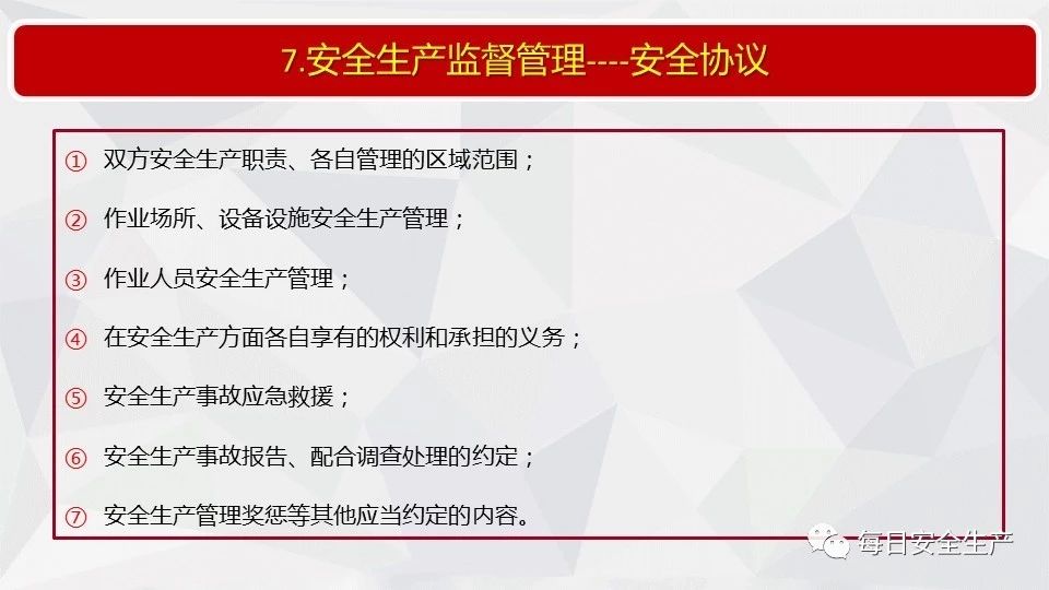 27 | 生產經營單位未與承包單位、承租單位簽訂專門的安全生產管理協議或者未在承包合同、租賃合同中明確各自的安全生產管理職責,或者未對承包單位、承租單位的安全生產統一協調、管理的 |