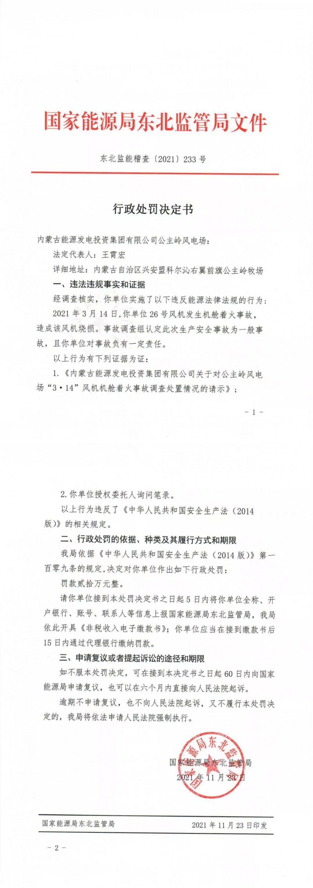 記者獲悉,11月23日,國家能源局東北監(jiān)管局通報(bào)關(guān)于公主嶺風(fēng)電場“3·14”風(fēng)機(jī)機(jī)艙著火事故行政處罰決定書,依據(jù)《中華人民共和國安全生產(chǎn)法(2014版)》第一百零九條的規(guī)定,決定對內(nèi)蒙古能源發(fā)電投資集團(tuán)有限公司進(jìn)行罰款20萬元整。