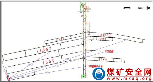 事故發生在一采區南翼 1303 工作面泄水巷及 3 號聯絡巷。(一)巷道布置1303 工作面泄水巷及 3 號聯絡巷位置。1303 工作面泄水巷及 3 號聯絡巷位于一采區南翼,其北部為一采區膠帶、回風及軌道下山,南至 G220 國道保護煤柱,東部為未采掘區域,西鄰未回采的 1303 工作面。1303 工作面泄水巷及 3 號聯絡巷設計長度 1191 米(平距),其中:3 號聯絡巷設計長度251 米,埋深 1027~1067 米,采用綜掘沿底板施工。1303 工作面泄水巷及 3 號聯絡巷鄰近開采情況。沖擊地壓發生時,事故區域附近無采掘活動。3 號聯絡巷下段掘進工作面距離正在回撤順槽設備的 1301 采煤工作面(10 月 15 日停采)1845 米,距離正在生產的 1302(上)采煤工作面 4554米,距離正在掘進的 1305 工作面膠帶順槽聯絡巷、1306 工作面膠帶順槽分別為 2842 米、3603 米。見圖 2。