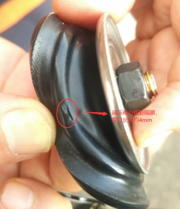 14、氣化器系統(含氣化器出口減壓閥)氣密性試驗情況:經淮南市特種設備監督檢驗中心安全閥校驗站使用0.5MPa壓縮空氣對氣化器系統進行氣密性試驗,發現減壓中間頸部呼吸孔處泄露,后拆解減壓閥,發現該減壓閥內橡膠隔膜破損,高壓側氣體直接通過破損的橡膠隔膜排出。