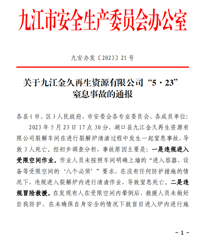 2023年5月23日17點30分,湖口縣九江金久再生資源有限公司裂解車間在進行裂解爐清渣過程中發生一起