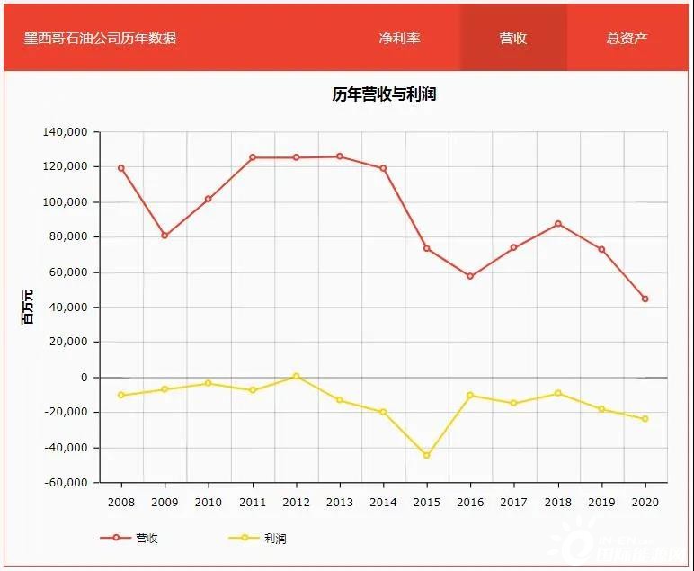 再看2008年至今的財報數據,這一區間內墨國油幾乎全部呈現虧損狀態,2020年遭遇疫情嚴重沖擊,虧損額度更是高達230億美元。