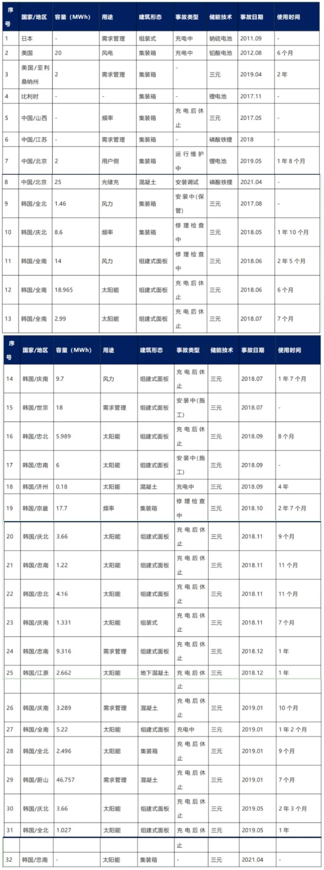 近10年間,全球共發(fā)生32起儲(chǔ)能電站起火爆炸事故。其中,日本1起、美國2起、比利時(shí)1起、中國3起、韓國24起。通過對行業(yè)公開信息進(jìn)行搜集整理,匯總了2011-2021年間,全球儲(chǔ)能項(xiàng)目主要火災(zāi)或爆炸事故。由于較多安全事故原因復(fù)雜,相關(guān)事件很多都未公開披露。